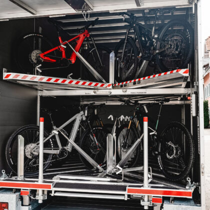 Die ersten 18 E- Bikes über die Laufläche einladen und mit Spannbügel sichern.